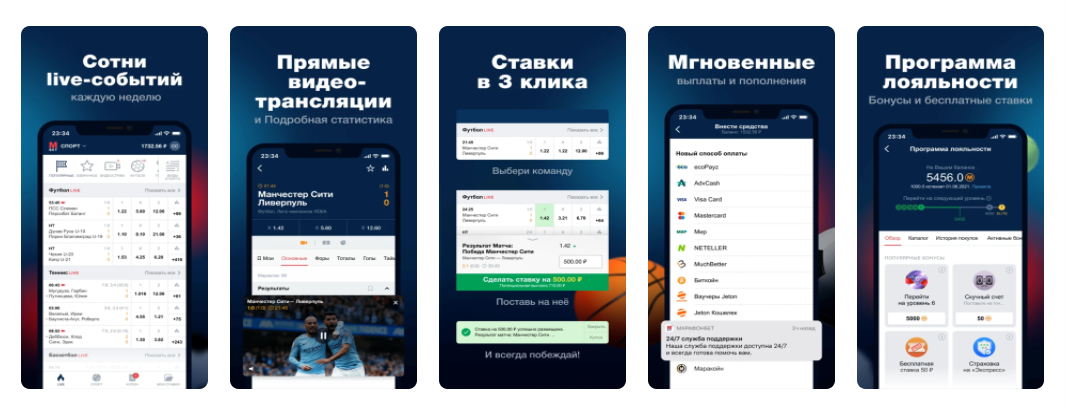 Мобильные приложения букмекера Марафон Бет свободно открываются с российской территории в обход блокировок Роскомнадзора. Они также поддерживают все возможности для игры на ставках: заключение пари, проведение операций со счетом, просмотр онлайн-трансляций, связь со службой поддержки, участие в программе лояльности и не только.