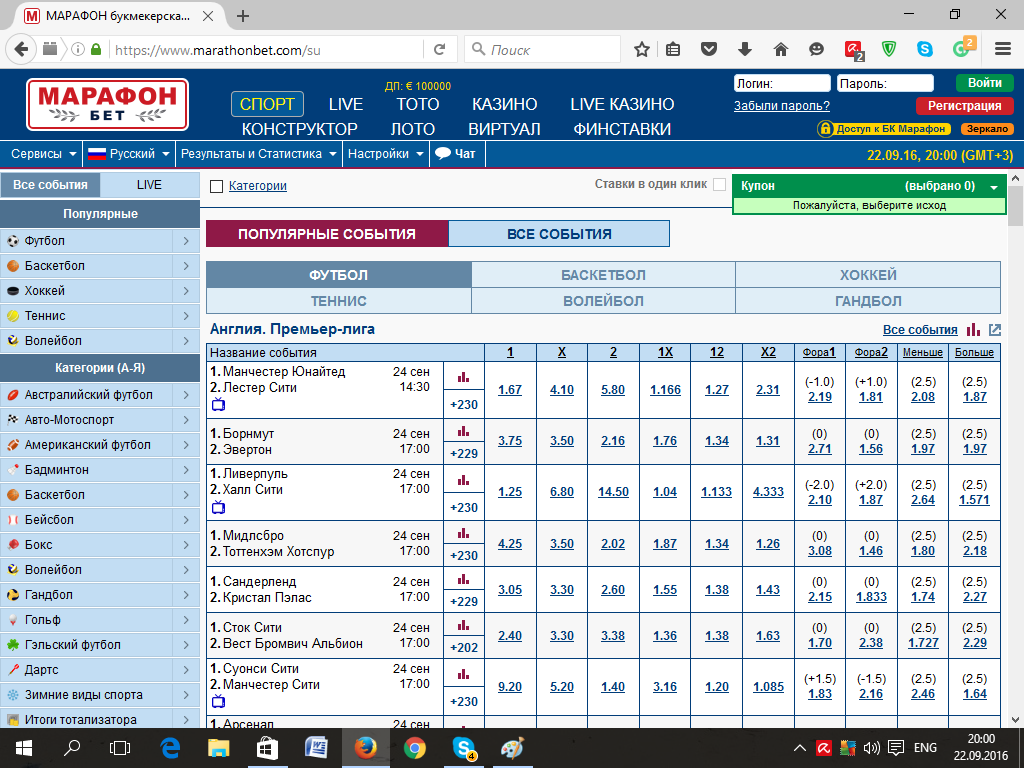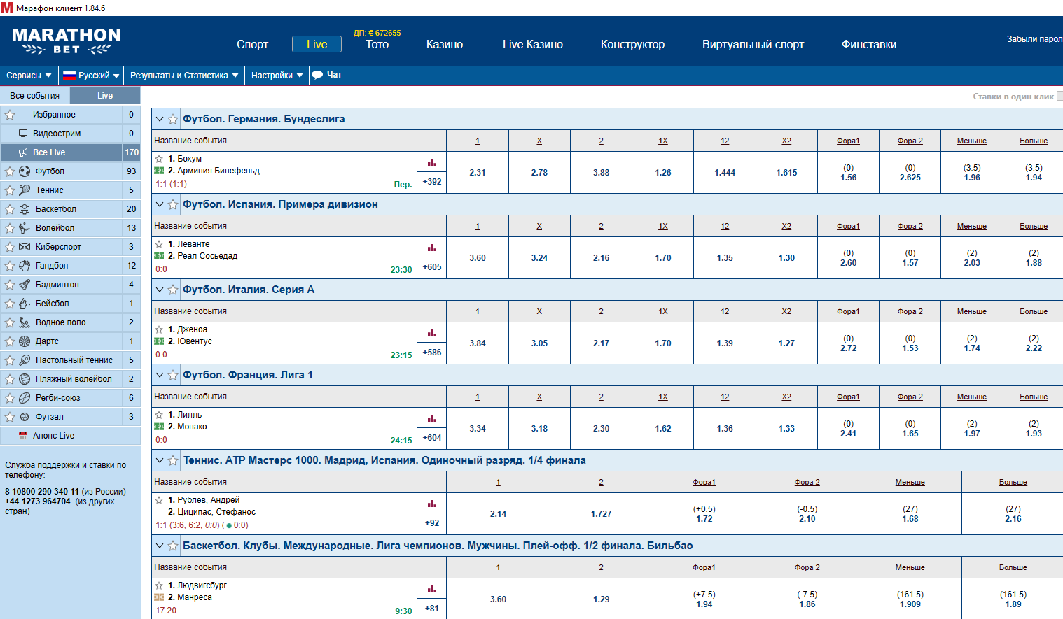 Наиболее вариативная роспись с большим количеством рынков, как и у всех БК, в Марафоне для ставок на футбольные соревнования. Для матчей европейских чемпионатов и РПЛ число маркетов доходит до 500-600. Даже на товарищеские матчи клубов Европы бывает около 250 видов пари. Много пари на статистику – угловые, штрафные, пенальти, удаления, и т.п. Есть комбинированные ставки, кроме того, можно ставить на авторство голов, статистику по интервалам, индивидуальные тоталы команд и игроков.