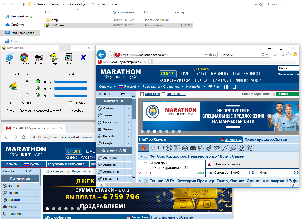 С запущенной утилитой Ultrasurf игроки могут открывать сайт МарафонБет без блокировок в браузерах Google Chrome и Internet Explorer.
