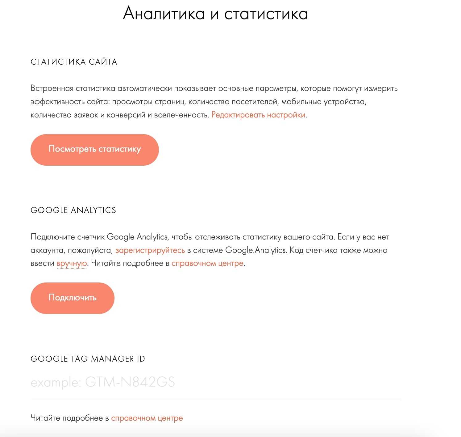 Аналитика – вы получаете доступ к внутренней статистике сайта, а также к данным Google Аналитика, Менеджер тегов Google, Яндекс.Метрика, Пиксель Facebook и VK и пр.