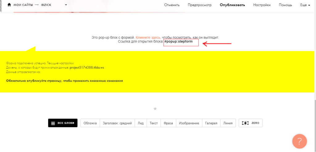 Публикуем сайт и смотрим, что получилось. Если все сделано правильно, увидим обложку своего квиза с кнопкой призыва к действию. Нажав на нее, перейдем в pop-up блок BF920, содержание которого идентично блоку BF919. Осталось настроить пошаговую форму опроса и квиз в ZeroBlock готов.