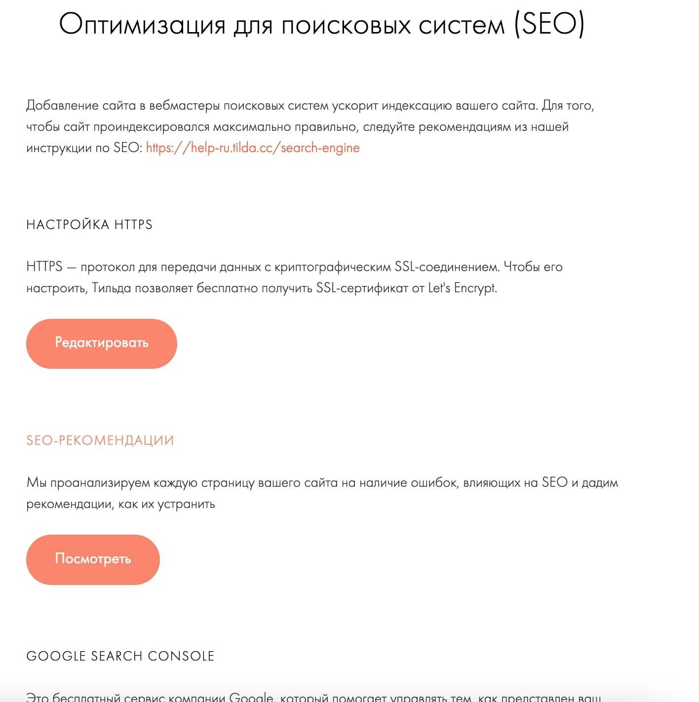 SEO – вы добавляете сайт в вебмастеры поисковых систем для ускорения индексации. Кроме того, вы можете воспользоваться SEO-рекомендациями сервиса Tilda и сторонних продуктов, например, Google, где ваш сайт проанализируют на предмет поисковой оптимизации и подскажут, какие области нуждаются в улучшении.