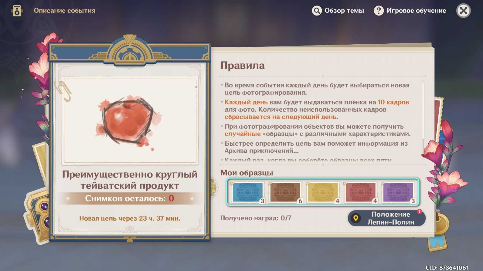 Лепин-Полин хочет изменить ситуацию. Для этого ей нужны фотографии разных объектов, за них она готова давать бонусы. Фотографии делаются специальной камерой. Всего доступно 10 фото в день.