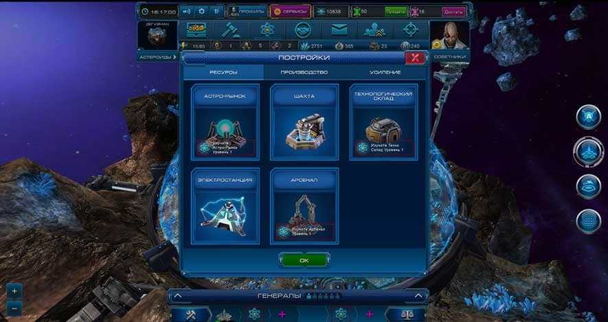 Развитие своей базы – далеко не весь процесс игры. Геймерам дают отличные возможности, которые помогают развивать владения: можно захватывать астероиды (до пяти единиц). Если сравнивать с основной базой, астероиды всегда могут быть захвачены другими игроками. Если не хочется допустить этого, нужно построить орбитальную боевую станцию, которую оснащают боеприпасами, артефактами и рунами.