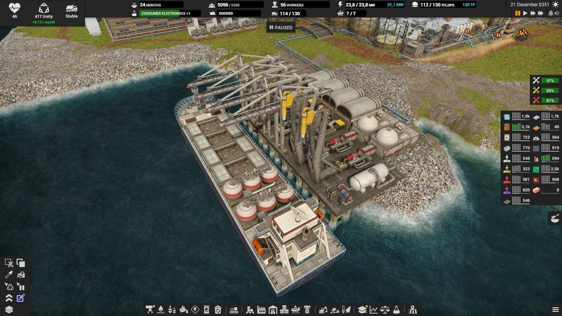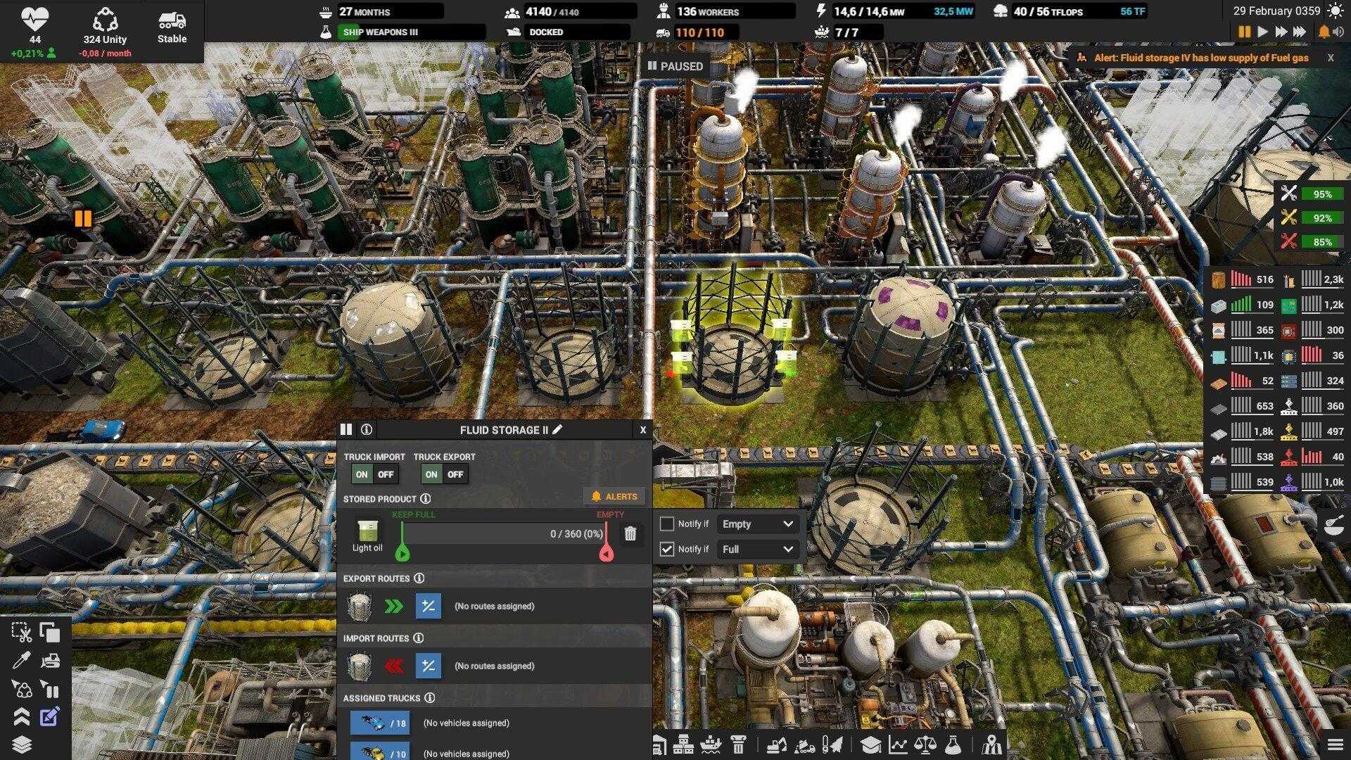 Химическая промышленность в игре представлена во всех гранях и градациях (одних нефтепродуктов аж 5 штук), так что вертеть её можно, как угодно, и перегонять во что угодно. Данному фактору стоит уделить немало внимания, потому что дизель — один из ключевых ресурсов игры. Если закончится он, то можно смело начинать партию заново.