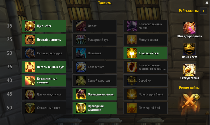 - 50 уровень – Праведный защитник. Незаменимый талант, который снижает кд основных защитных способностей.