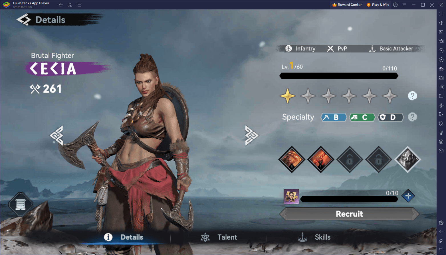 Cecia является персонажем-берсерком, способным наносить огромный урон своими атаками и накладывать дебаффы на врагов. Ее пассивное умение “обоюдоострый меч” усиливает атаку ее войск, но за счет снижения их защиты, делая ее уязвимой на поле боя. Тем не менее Cecia отлично подойдет к любой команде, желающей быстро нанести огромный урон.