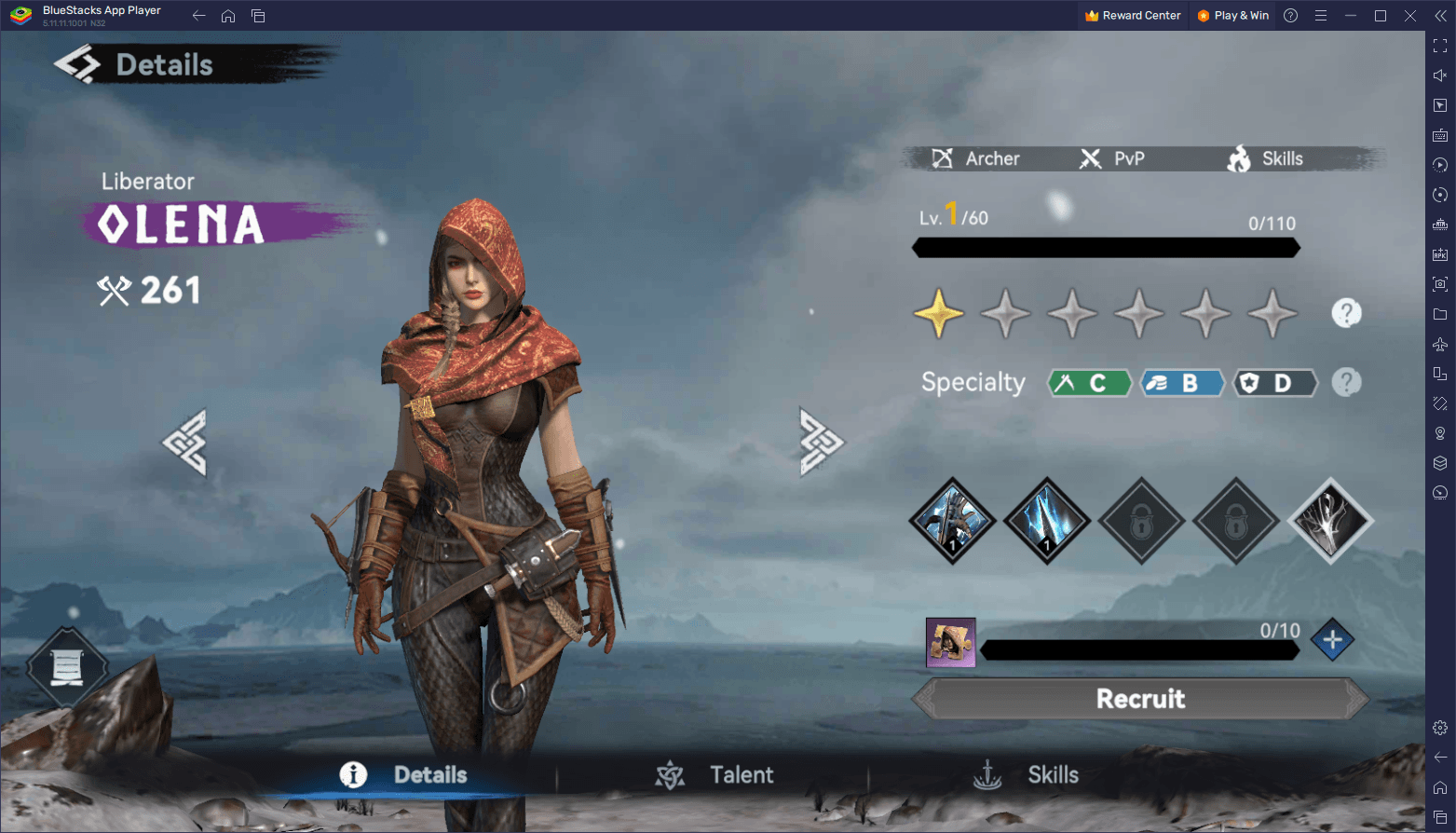 Olena — сильная героиня, специализирующаяся на повышении навыков и способностей войск дальнего боя. Ее умения не только наносят значительный урон, но и увеличивают генерацию ярости ее отряда, что позволяет ей использовать свои способности чаще и наносить еще больший урон врагам.