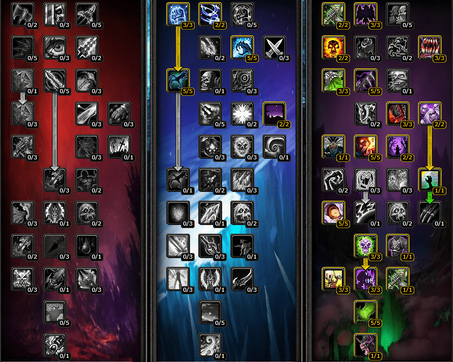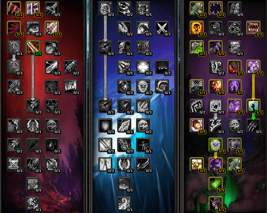 The Blood Variant focuses on the Blood talent tree as our subspec, providing you with bonuses that turn you into a hybrid. The entire build is centered around runic power generation, with talents such as Butchery, Scent of Blood, and Runic Power Mastery. The whole idea behind this variation is to grant you increased survivability through Rune Tap and Blade Barrier, with the boosted runic power generation letting you consistently spam Death Coil!
