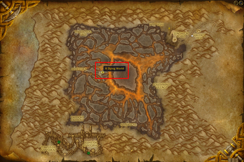 This NPC will offer you “A Dying World” quest, which will send you to Magni Bronzebeard in Silithus and start the small quest chain that leads to you getting your legendary neck-piece.