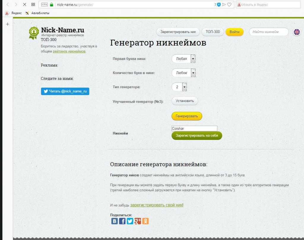 - Nick-name.ru/generate – это один из самых известных сайтов по созданию никнеймов. В этом генераторе можно задать первую букву и общее количество знаков в нике, а также сразу зарегистрировать полученный никнейм на сайте. Ресурс генерирует только англоязычные ники.