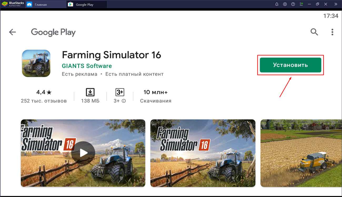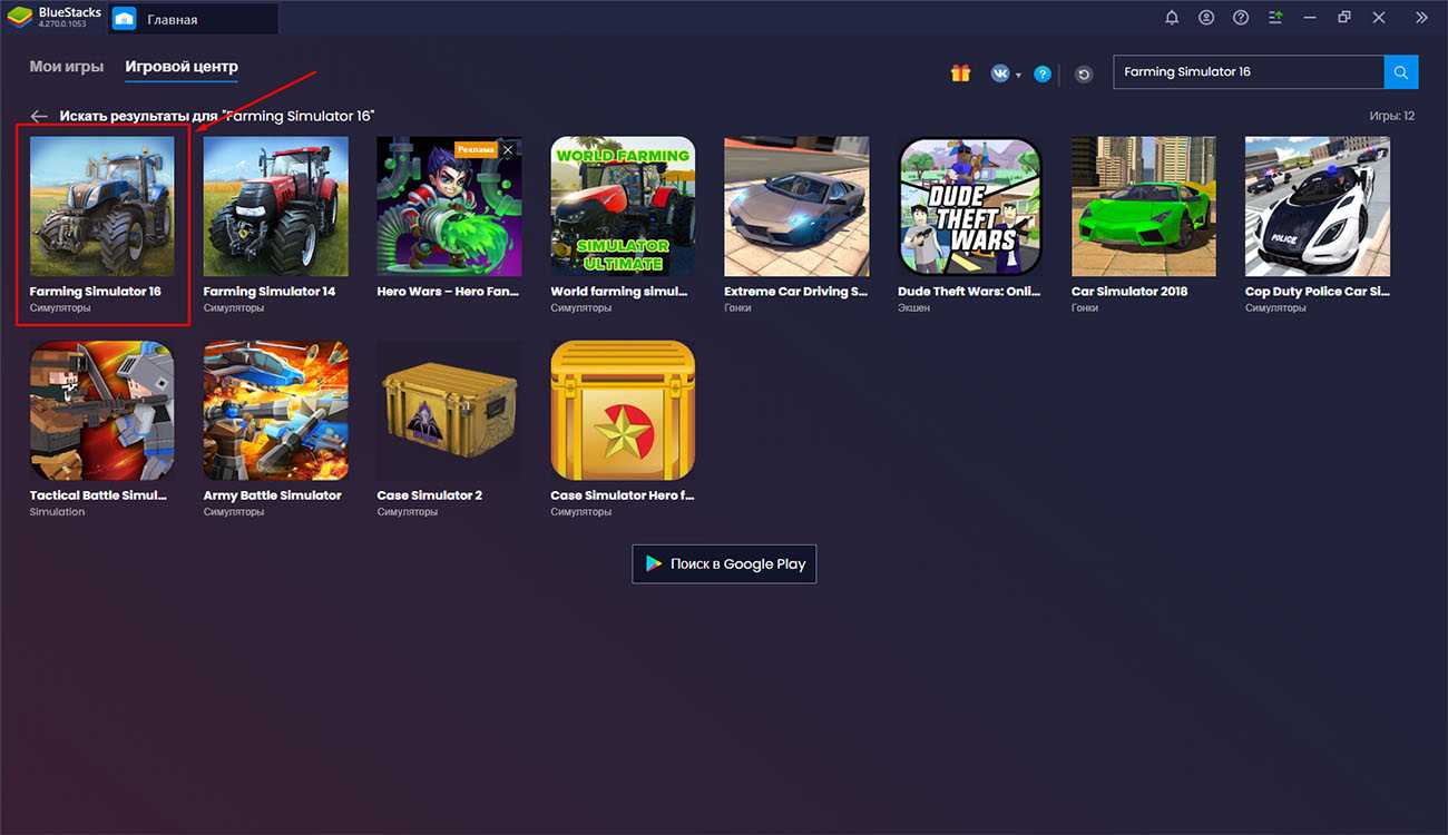 Среди результатов поиска найдите игру Farming Simulator 16 и нажмите на кнопку «Установить».