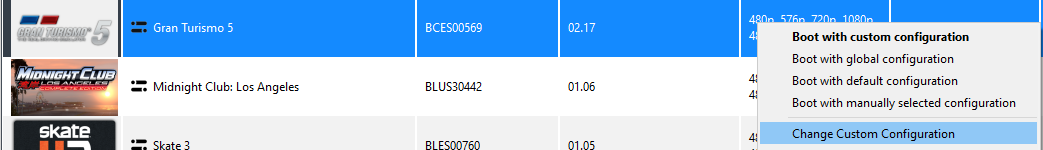 Запустите эмулятор и нажмите правой кнопкой мыши по иконке “Gran Turismo 5”, после чего в выпадающем меню щелкните левой кнопкой по пункту “Change/Create Custom Configuration”: