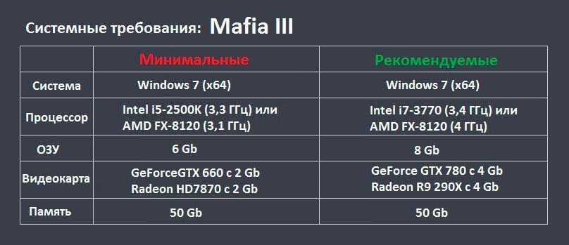 Возможно, сегодня эти требования кажутся вполне обычными и действительно тянут на «минимальные», но на момент выхода «Мафии 3» (2016 год), они были выше средних. В тот момент рядовому потребителю хватало процессора Intel I3, Intel I5 новой версии пока стоили дорого, и не каждый мог позволить их купить, не говоря уже про Intel I7.