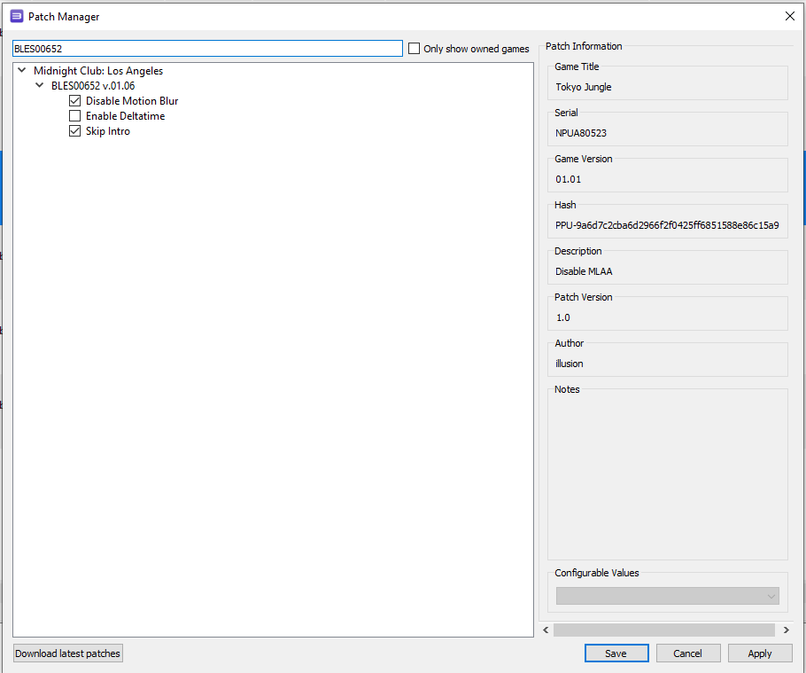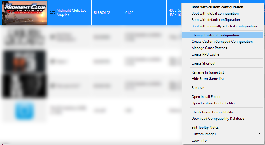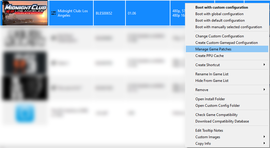 Запустите эмулятор и нажмите правой кнопкой мыши на иконку “Midnight Club: Los Angeles”, после чего в выпадающем меню щелкните левой кнопкой на пункт “Manage Game Patches”: