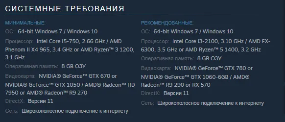 - Процессор — Intel Core i5-750 2.66 GHz / AMD Phenom II X4 965 3.4 GHz / AMD Ryzen 3 1200 3.1 GHz.