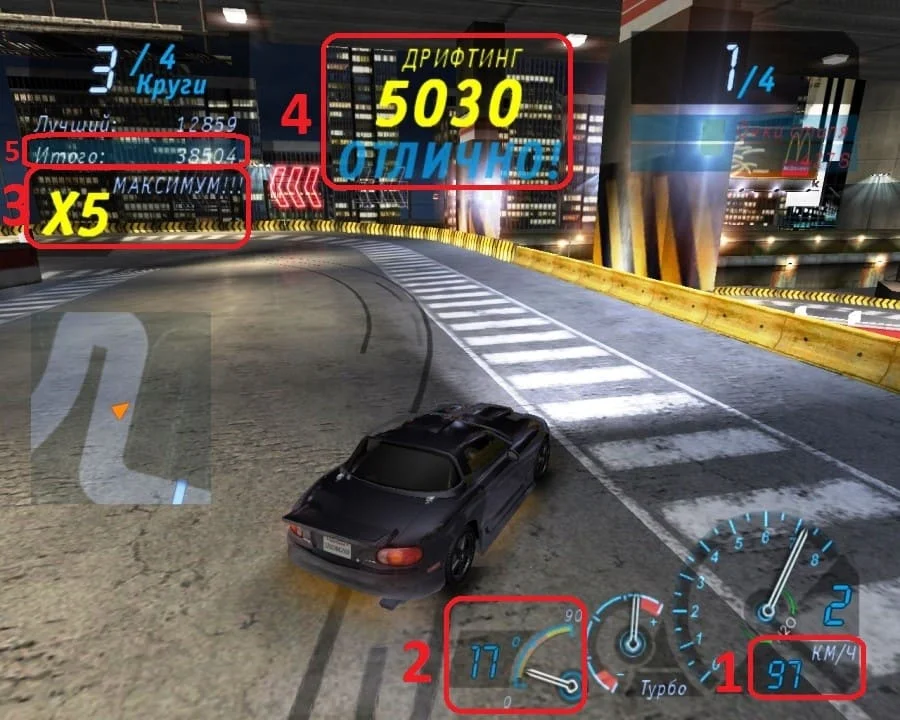 Множитель в дрифте увеличивается за счёт набора очков за 1 занос. Ступени увеличения множителя на начальном этапе игры: 250, 1000, 3000, 8000. т.е. что бы получить множитель «4» нужно за один занос набрать более 3000 очков. Эти ступени будут расти по мере прохождения игры. Множитель уменьшается, когда Вы едете слишком медленно и обнуляется, когда Вы врезаетесь.