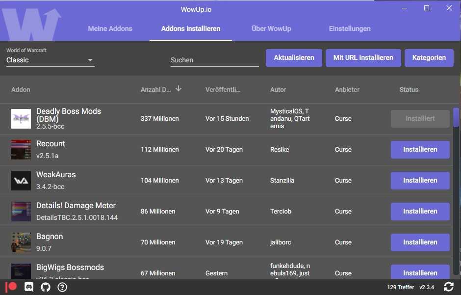 Вы просто выбираете каталог установки WoW (то есть »_classic_«), затем нажимаете «Установить аддоны», и вы можете загружать дополнения из отображаемого списка по своему усмотрению.
