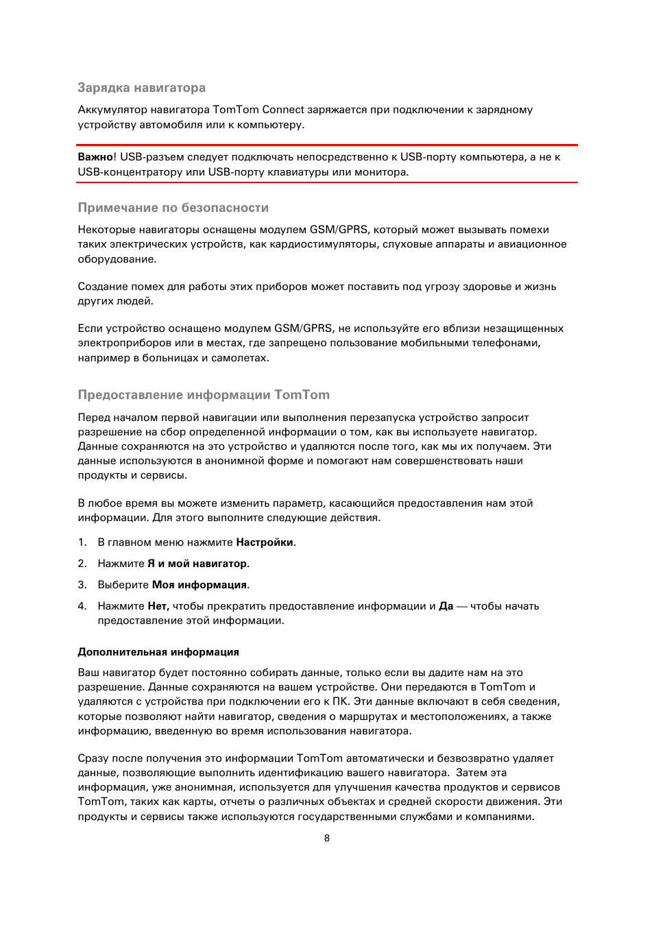 Дополнительная информация Ваш навигатор будет постоянно собирать данные, только если вы дадите нам на это разрешение. Данные сохраняются на вашем устройстве. Они передаются в TomTom и удаляются с устройства при подключении его к ПК. Эти данные включают в себя сведения, которые позволяют найти навигатор, сведения о маршрутах и местоположениях, а также информацию, введенную во время использования навигатора.