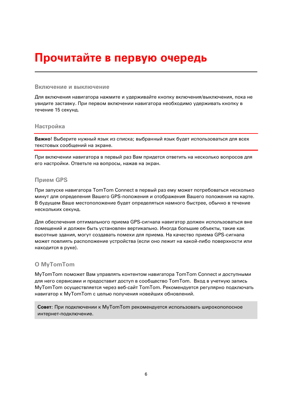При запуске навигатора TomTom Connect в первый раз ему может потребоваться несколько минут для определения Вашего GPS-положения и отображения Вашего положения на карте. В будущем Ваше местоположение будет определяться намного быстрее, обычно в течение нескольких секунд.