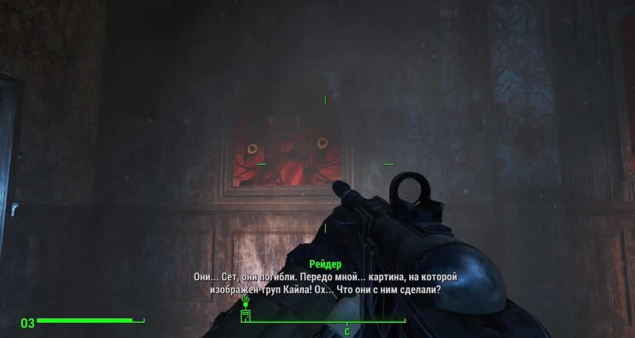 Мирных жителей Пустоши Пикман не трогает, поэтому назвать его злодеем сложно, но у него определенно проблемы с головой. Это видно по галерее – всюду жуткие картины с кровавым фоном, комнаты и стены забрызганы кровью, а у входа в подвал валяется гора трупов.