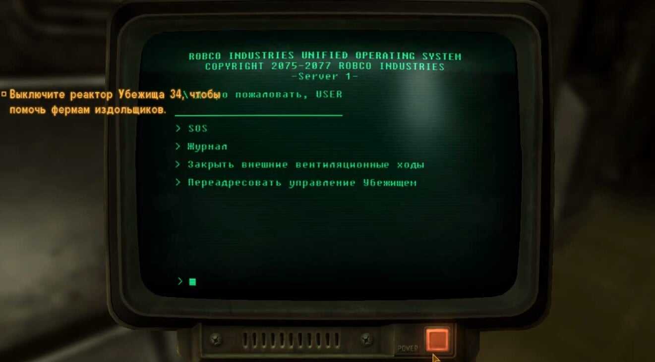 Загвоздка в том, что в комнате персонала от радиации спасаются несколько выживших, и если отключить реактор, то двери внутренних помещений навсегда закроются. Альтернативный выбор – переадресовать управление убежищем на терминал в комнату персонала. Так жители спасутся и начнут новую жизнь в парке для беженцев «Аэротех», но радиация в воде заставит фермеров покинуть нажитые места и найти новое занятие в Пустоши.