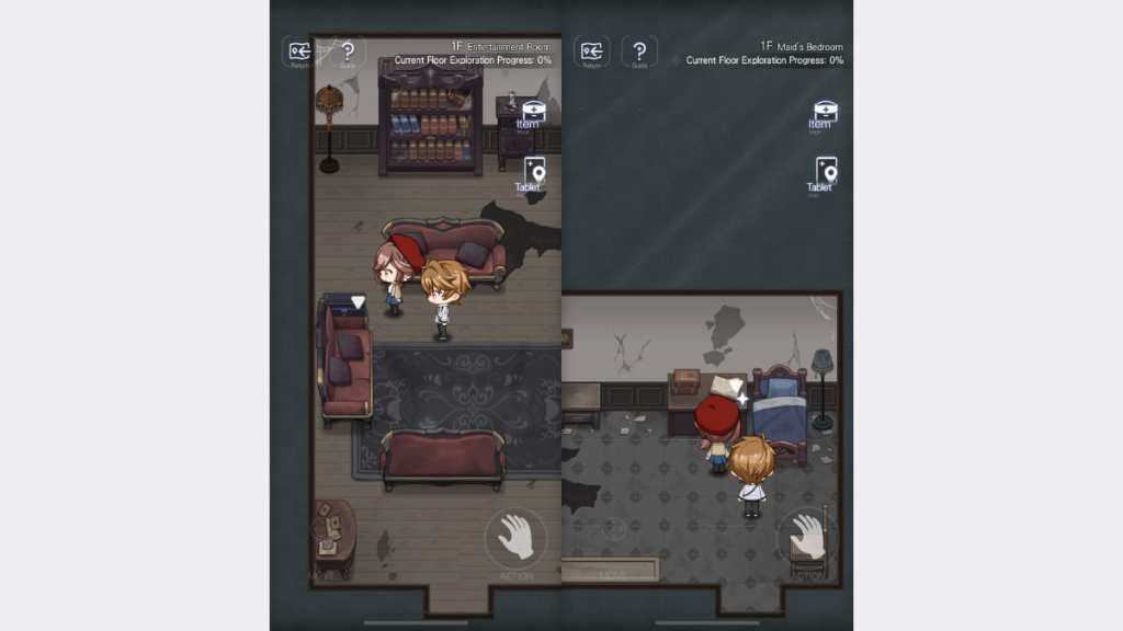 Upon entering the Manor of Hermes, you can control Rosa and your accompanying male lead by swiping along the movement circle at the bottom left of the screen. There are various Investigation spots in the expansive abode’s 50 rooms, which you can interact with by clicking on the Action button at the bottom right of the screen.