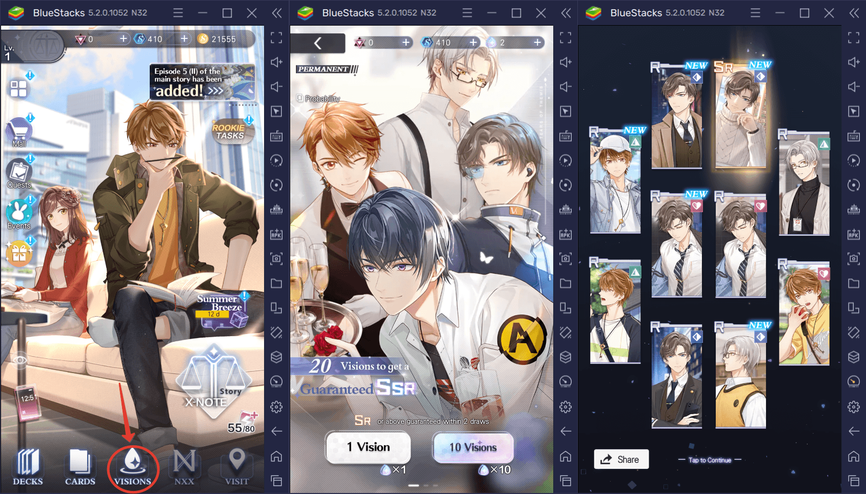 Чтобы получить карты персонажей для дебатов, нужно призвать видения с помощью слез Фемиды — особого ресурса, который дается в награду за выполнение заданий. Карты можно получать по одной или целой «пачкой» по 10 штук. Для того чтобы провести ритуал призыва, в главном меню перейдите во вкладку Visions.