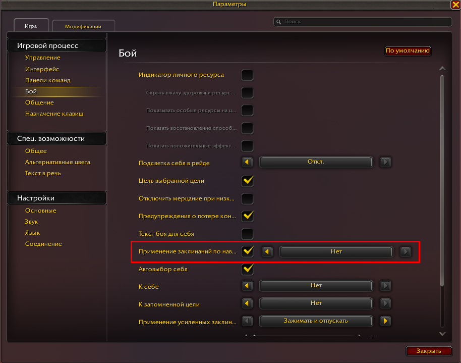 - Сбивание каста по фокусу, если фокуса нет, то сбивает цели под маусовером. Если там нет врага, то сбивает текущей цели: