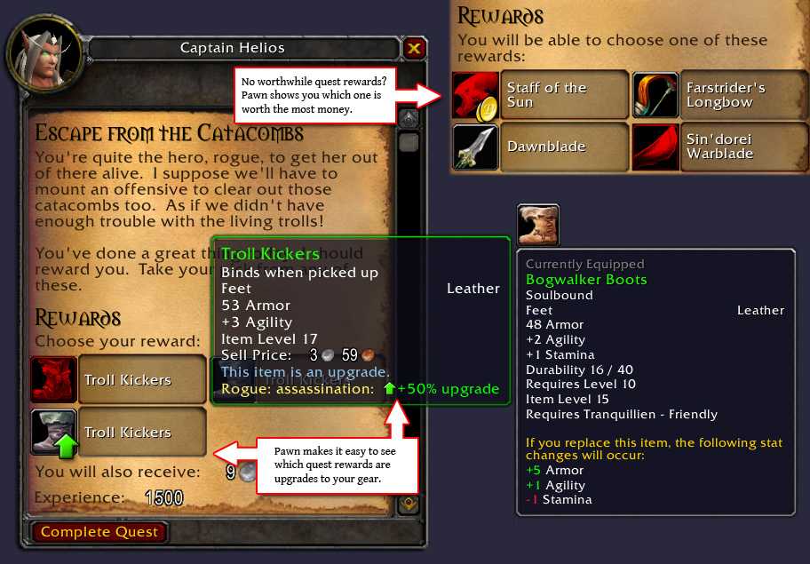 Стандартный аддон, позволяющий выбрать междудвумя предметами экипировки одинакового уровня, но с разными вторичными характеристиками. Показывает, на сколько та или иная вещь лучше для определенного спека.