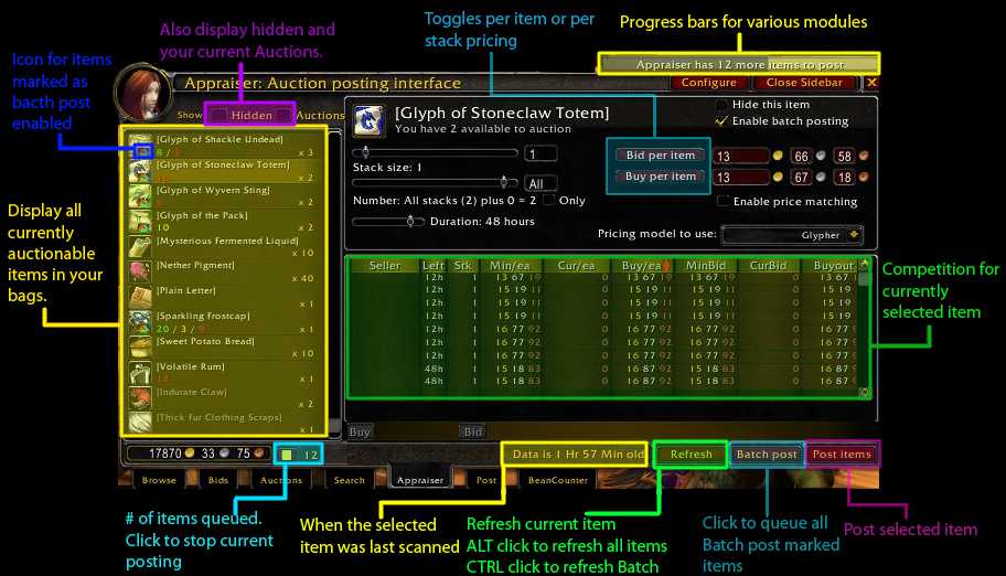Аддон предоставляет вам инструменты и данные, которые помогут вам принять трудное решение проще. От покупки до продажи лотов, Auctioneer использует подсказки и инструменты проверенные временем, что должно помочь вам заработать немало золота.