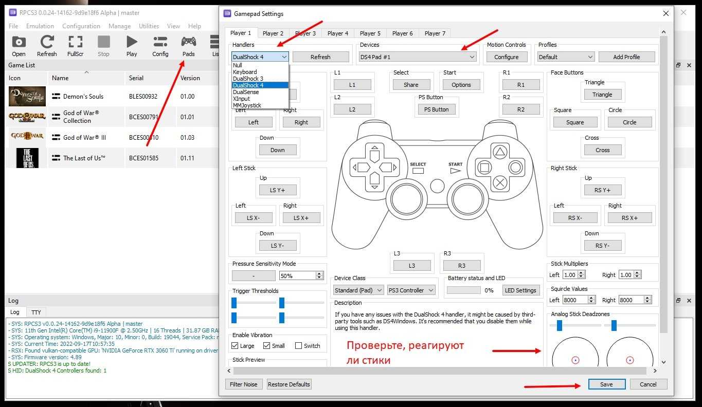В пункте Devices выберите активный контроллер (не должно быть написано disconnected), если геймпада нет в списке, нажмите Refresh правее Handler, проверьте, как реагируют стики, если все в порядке, нажимаем Save.