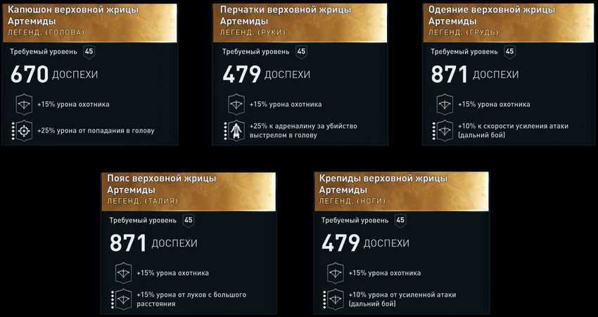 - : Для получения комплекта необходимо пройти все задания, связанные с побочным заданием «Дочери Артемиды». Побочное задание состоит из 8-ти отдельных подзадач. В этих подзадачах предстоит убить 7-мь легендарных зверей. Каждое животное будет отмечено на вашей карте, поэтому их вы обязательно встретите в ходе изучения/исследования локаций в игре. Список зверей, которых необходимо убить: Немейский лев, Калидонский вепрь, Керинейская лань, Эриманфский кабан, Критский бык, Ликаонский волк, гиена. Задание берётся в регионе под названием «Фокида», после посещения храма Артемиды, который расположен на вершине горы. Кстати, там можно будет убить первого зверя – Калидонского вепря.
