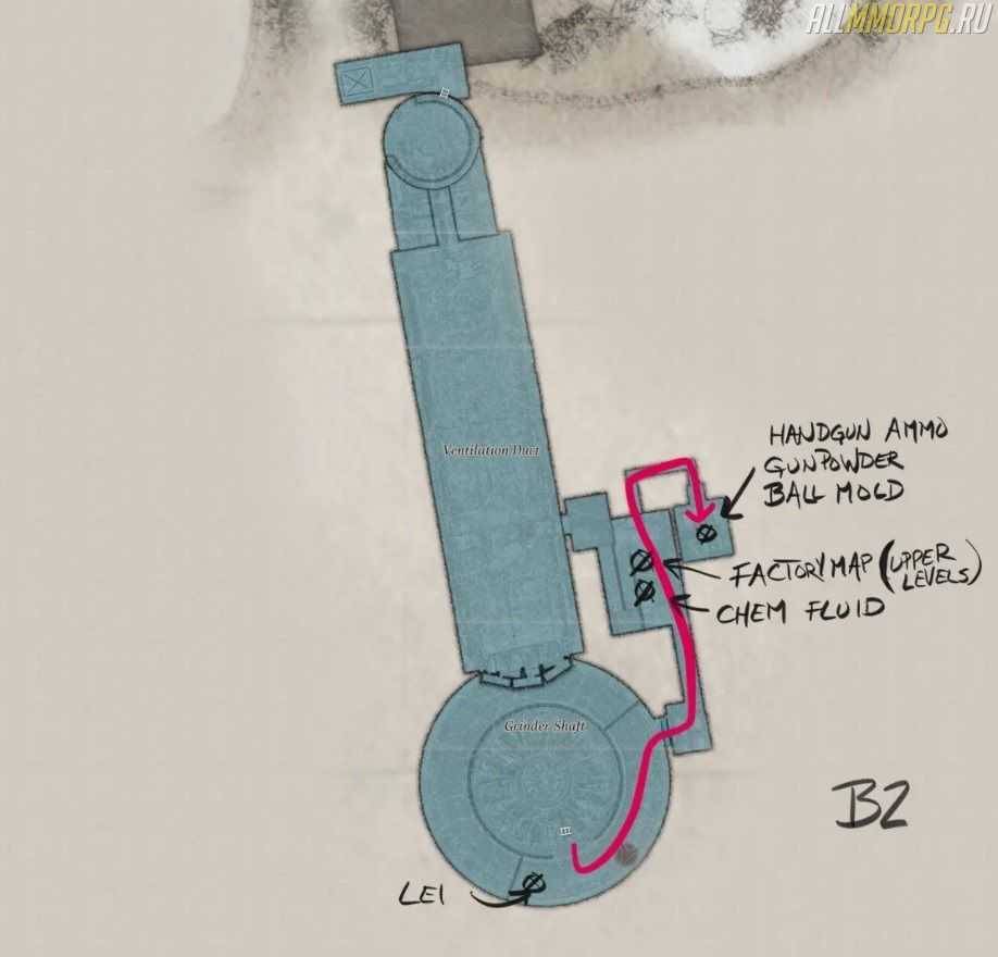 Поднимитесь по лестнице, сверните направо. Обыщите ящик, возьмите реагент и прочитайте заметки с данными о создании модифицированных солдат. Информация из заметок пригодится вам, чтобы эффективнее убивать таких монстров. Покидая помещение, заберите карту верхних уровней фабрики.