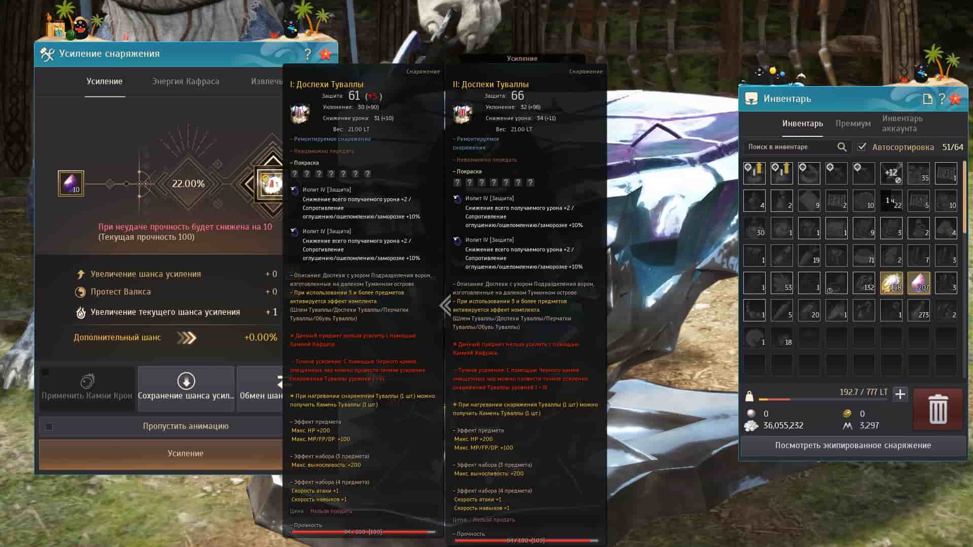 Снаряжение и бижутерию Туваллу намного легче улучшить, нежели обычное снаряжение или снаряжение Босса. Снаряжение Туваллы имеет повышенный шанс на заточку на всех стадиях. Однако вам все равно понадобится много черных камней времени и камней Туваллы чтобы заточить весь круг на 20.