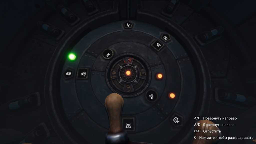 Самый простой тип задачек, который встречается в We Were Here Forever – это “подсказка-действие”. Пока один персонаж крутит тот или иной механизм, второй должен сообщить ему информацию, позволяющую выставить все правильно. К примеру, в одной из комнат вашему напарнику нужно будет открыть большую круглую дверь, воспользовавшись информацией из находящихся у него в комнате книг и ваших подсказок. В своей комнате вы видите круг из трех дисков и компас посередине, а вокруг множество иероглифов. Чтобы сообщить их, придется давать информацию о координатах и называть сами знаки. А так как большинство людей в этой символике не разбираются, описывать увиденное зачастую приходится фразами типа “кружочек с тремя лепестками”, “что-то похожее на тюльпан в кругу” и т.д.