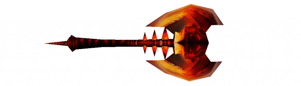 – падает с Принца Шаффара. Красивый топор с четырьмя лезвиями. – падает в случае прохождения северного крыла без убийства офицеров- . Сейчас это делается очень просто безо всяких проблем. – падает с Терона Кровожада. – ничего особенного, но это топор Грома Адского крика. И забавно наверное, членам Альянса убивать Гарроша оружием его же отца. Падает с Малчезара в Каражане. – падает с Рагнароса. – красивый топор, падает со Змеестража Когтя Смерти.