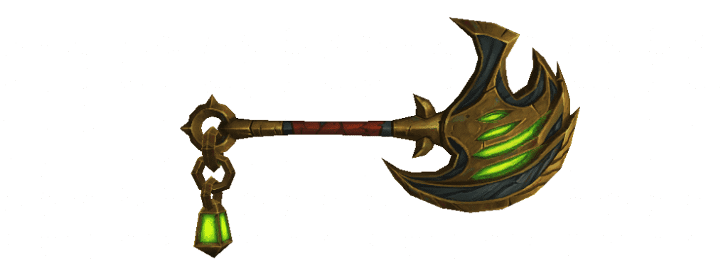 – награда за цепочку квестов Код проклятия. Выглядит просто круто – зеленое сияние, простая форма. Топор, а не карамелька на палочке. – падает с Короля воронов Айкисса. – падает с Охотника вечности. Топор оригинальной формы.