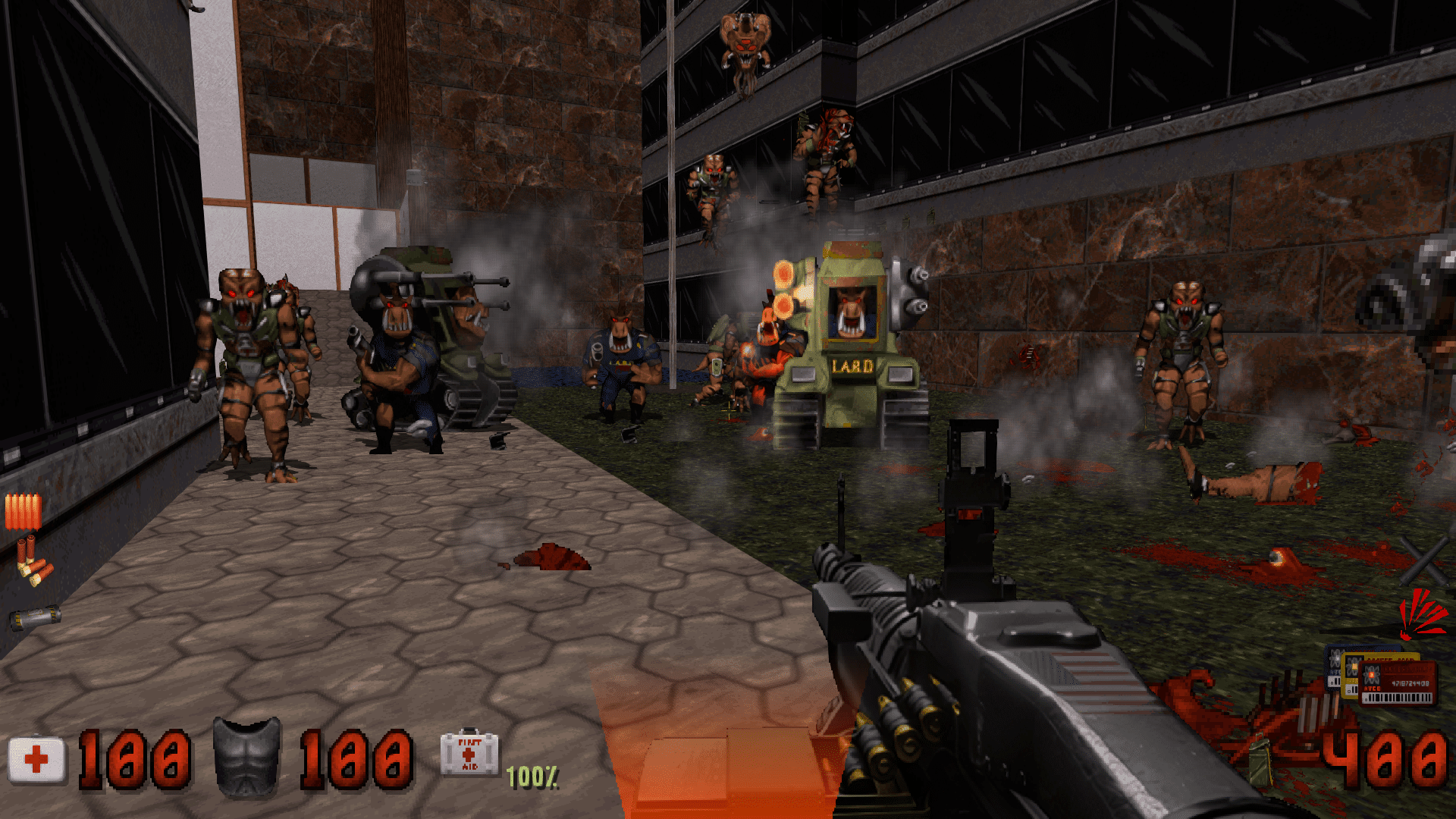 Each weapon now has either an alternate firing mode or can be dual-wielded. So, now you have a Golden Desert Eagle, a pair of Revolvers, and Alien Weapons, and some of the weapons have been completely reworked. For example, the Devastator no longer kills enemies instantly, but now has two mods (missile bombardment, and lock on heat seekers) for you to choose from. Freezethrower is now basically a tool, called the “Caterkillar Platform”, and can be switched to Flamethrower or a Laser Chainsaw. This is particularly clever since the sprites are relatively similar.