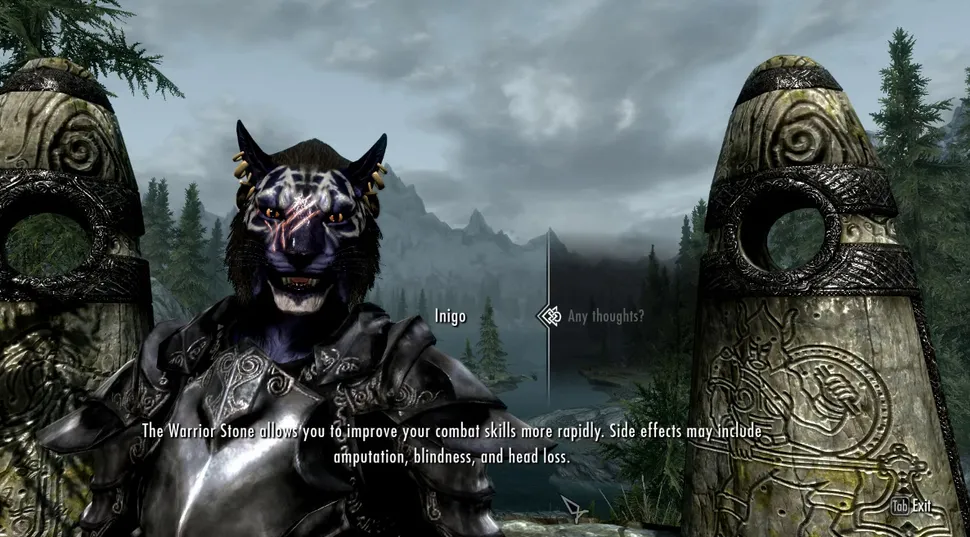 Возможно, вы не думаете, что голубой каджит, который следует за вами, комментирует все и саркастически отзывается о Лидии, — это то, что нужно Скайриму, но поверьте нам в этом. Иниго — последователь с множеством диалогов, некоторые из которых связаны с его собственной цепочкой заданий, а другие всплывают в подходящее время в зависимости от того, где вы находитесь. Ему можно сказать, куда идти и что делать, свистом, и он будет следовать за вами, даже если у вас уже есть спутник, болтая с ним благодаря умело измененным голосовым репликам.