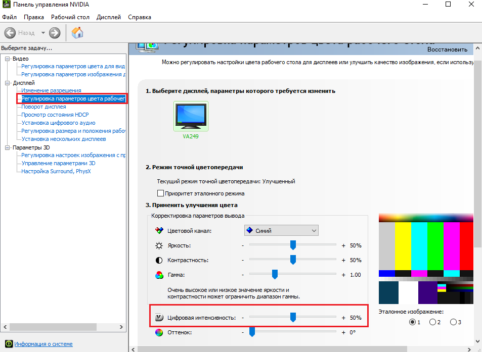 Для того, чтобы изменить насыщенность, пройдите по следующему пути: «Мои VGA-экраны» — «Отображаемый цвет VGA» — насыщенность. Выставляем параметр на максимум, либо на комфортное значение.