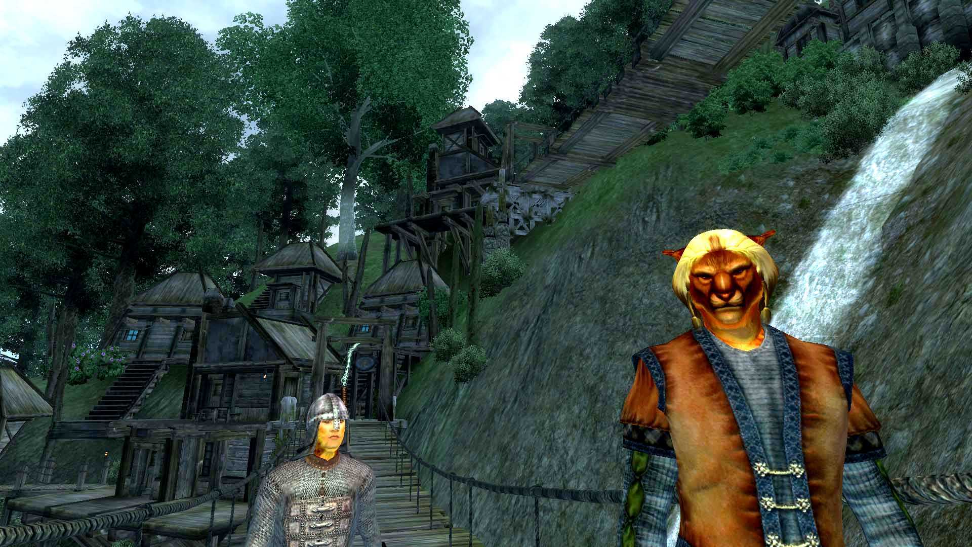 (Image credit: Bethesda) Первый город, через который я проезжаю, – Риверхолд, расположенный сразу за южной границей. Он не сразу отличается от Киродиила – все так же много зелени, кустарников и водопадов, как и в других местах базовой игры Oblivion. Однако в городе я быстро сталкиваюсь с различными “фурстоками” кхаджитов. Большинство из них никогда ранее не встречались в играх серии Elder Scrolls, были лишь описаны и зависели от воображения и изобретательности моддеров, работавших над Anequina. В Риверхолде полно кхаджитов, которых любители истории наверняка узнают, хотя они и не могут сравниться с воплощениями собственных творений Bethesda в The Elder Scrolls Online. Cathay, одна из играбельных рас большинства игр серии Elder Scrolls, смешивается с Ohmes, имеющими физические и внешние черты босмерских эльфов, только с мехом на макушке. Похожий на домашнего кота Альфик и большой кот Сенче, похоже, основаны на одной и той же модели большой кошки, похожей на пуму, но уменьшенной и увеличенной соответственно. По замыслу или по техническим причинам ни с Альфиком, ни с Сенче нельзя разговаривать. Другие хаджиты говорят много, хотя, конечно, их озвученные реплики – это только приветствия типа “Привет!” и другие небольшие фразы, которые уже существовали в базовой игре Oblivion для персонажей-хаджитов. Более конкретные реплики, связанные с выдачей квестов, представлены только текстом. Согласно преданиям Elder Scrolls, ученые альфики не любят говорить при посторонних, что порождает слухи о том, что они на самом деле немые. Видимо, мой вор-хаджиит для них все-таки чужак.