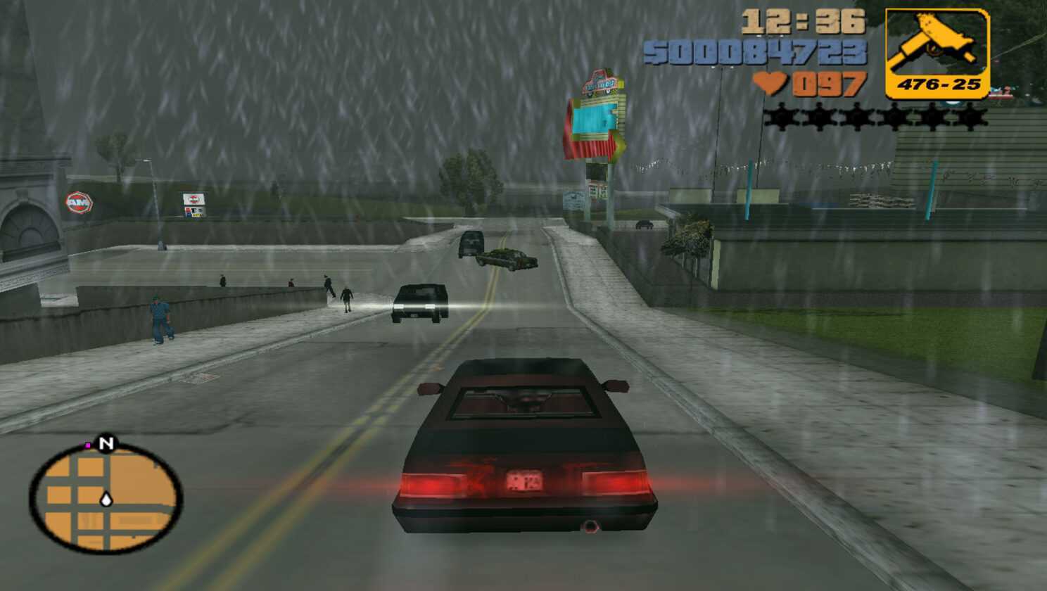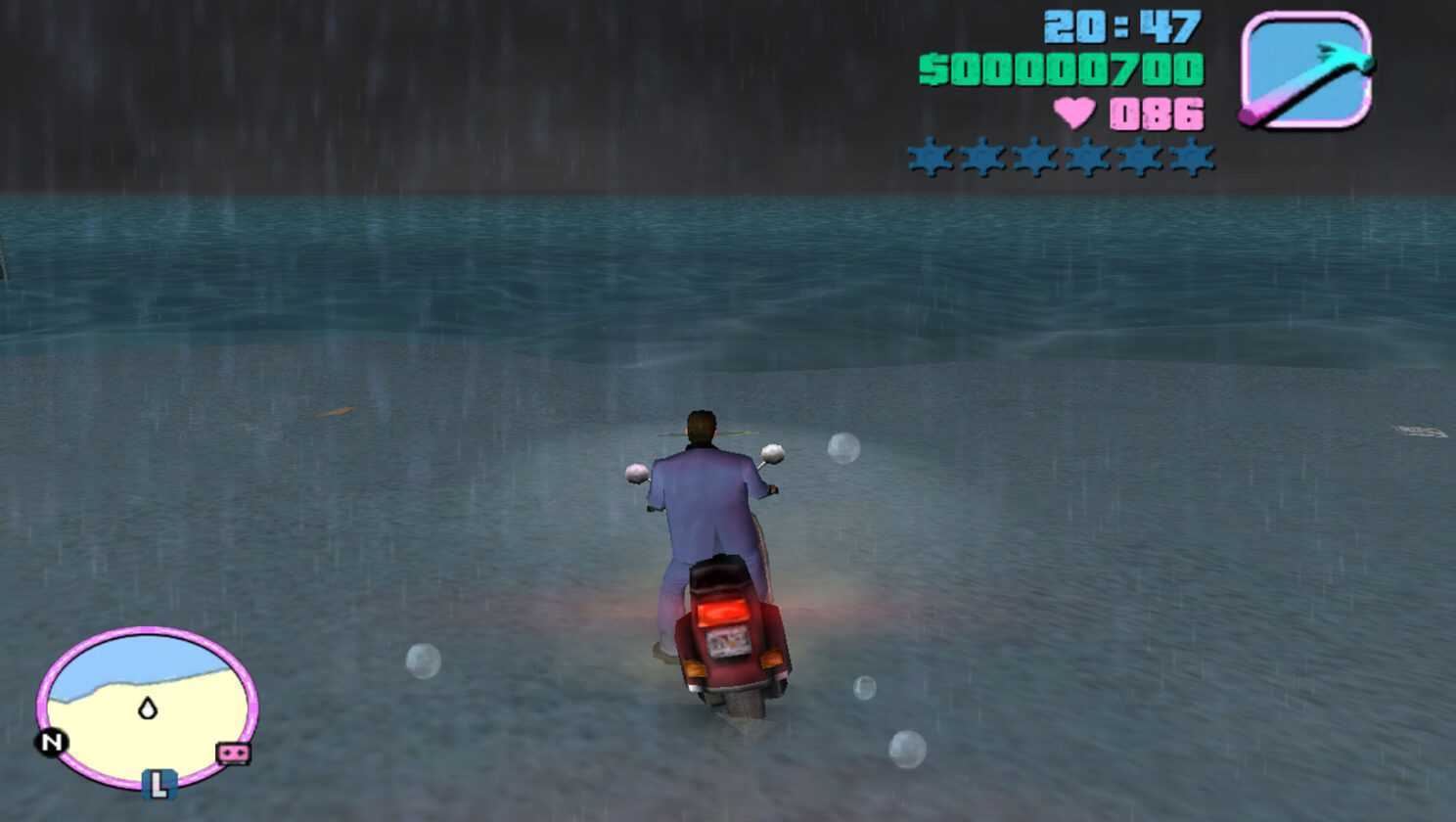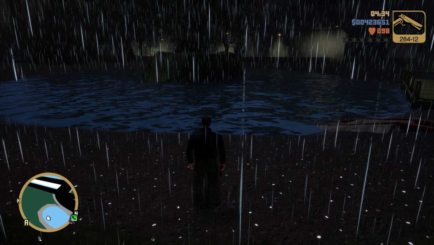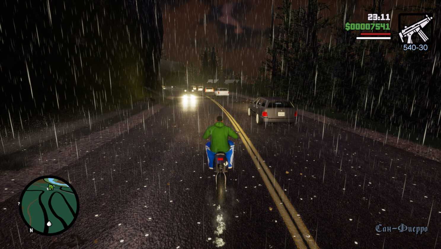 Отдельно хочется упомянуть дождь. В оригинальных частях он хоть и выглядел странно, но всё же имел интересную техническую реализацию. В GTA 3 и Vice City дождь состоит из трёх элементов: стена дождя прямо перед камерой игрока, крупные случайные блоки дождя перед игроком и такие же случайные анимации капель на поверхностях. Разглядеть их сложно, но можно. При этом в San Andreas дождь ужасный — это сочетание редких дождинок и странного зернистого фильтра.