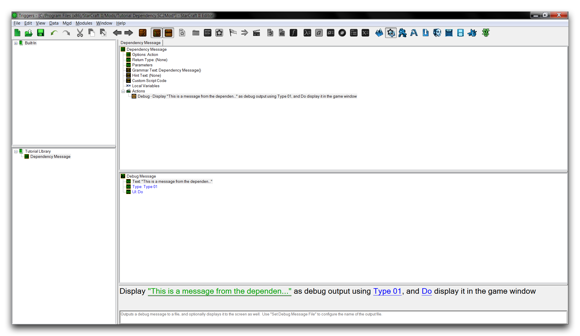 A mod’s eventual purpose is to be a container for assets. You can learn more about this by populating your basic mod with some triggers. Note that a mod file will require a trigger library to hold its triggers. This is not the case for map files, which can support triggers that are outside of a library.