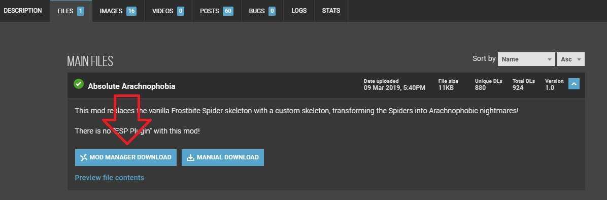 - Мод из Nexus скачивается через Менеджер модов, расположенный во вкладке «files»