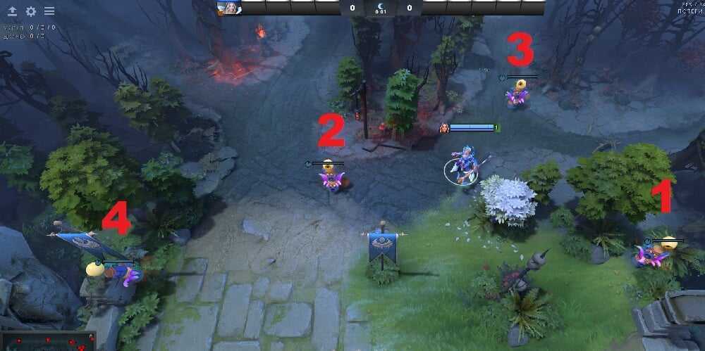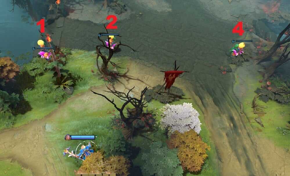 Варды №1 и №2 – самые нехитрые, они покажут перемещения вражеской четверки на линии и реке. Если вы увидели, что ваш оппонент на линии купил Сентри, скорее всего он будет проверять точки Вардов №1-3, и неплохим вариантом будет пройти аккуратно в кустах слева и поставить Вард №4. Если вас давят на линии, вы не можете пройти дальше пачки крипов, то можно поставить Вард №3, но только в том случае, если нет Сентрей у вражеской четверки, иначе его легко снимут.