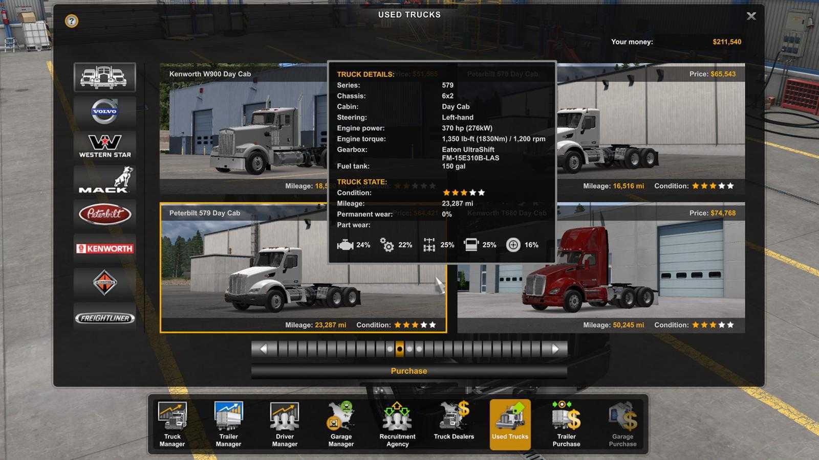 Изменение полностью совпадает с Euro Truck Simulator 2. У новых дилеров можно приобрести б/у транспортные средства за меньшее количество денег, если у вас ограниченный бюджет. Это идеальный выбор, чтобы сэкономить на начальной стадии игры, чтобы накопить на новый грузовик. Однако, у подержанных авто есть свои нюансы — уровень поломки. Чем больше у машины пробег — тем больше проблем. Состояние грузовиков постоянно ухудшается, а определить текущее состояние можно по звездам (всего 5 звезд, чем больше — тем машина свежее).