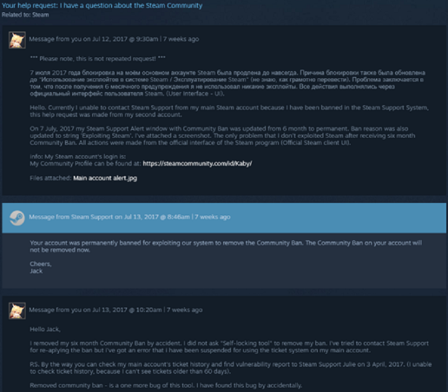 Как любой порядочный гражданин, Kaby сообщил о своей находке в техподдержку, однако уязвимость не устранили даже за несколько месяцев. Чтобы хоть как-то расшевелить сотрудников Valve, Kaby заблокировал друга (с согласия последнего), за что получил бан продолжительностью в шесть месяцев. В качестве причины бана сотрудник по имени Джек назвал злоупотребление функциями сервиса.