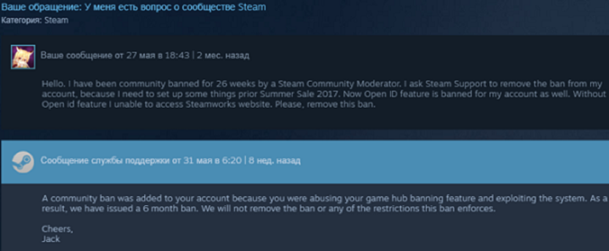 В русскоязычном сообществе Steam несчастному сообщили, что бан этот выдан обоснованно и снят не будет.