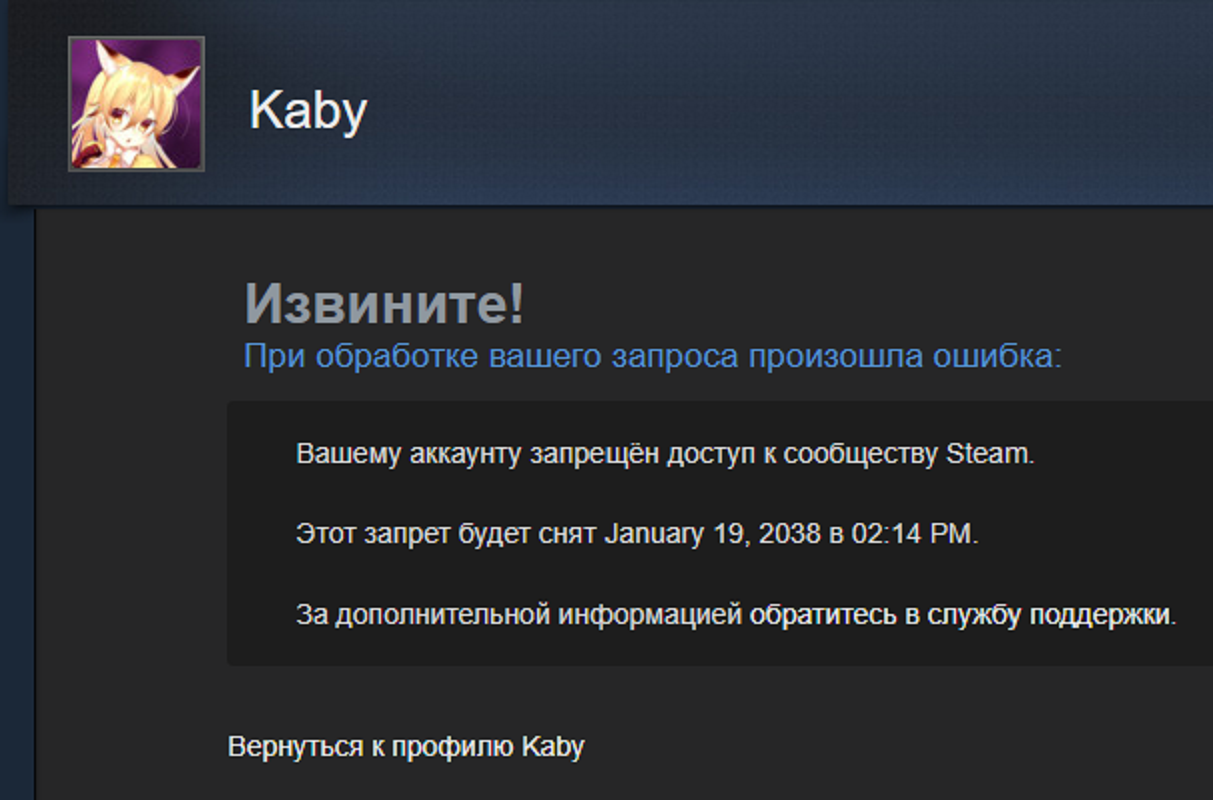 Кроме того, за то, что Kaby разбанил сам себя, ему еще и выписали перманентное ограничение. Пользователь пробовал несколько раз обратиться в техподдержку, но его игнорировали. После этих многочисленных запросов со страницы Kaby в Steam исчезло все содержимое, а сам профиль был изъят из публичного просмотра. Попытавшись внести изменения в профиль, пользователь увидел, что его акк заблокирован аж до 2038 года.